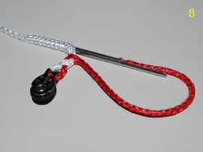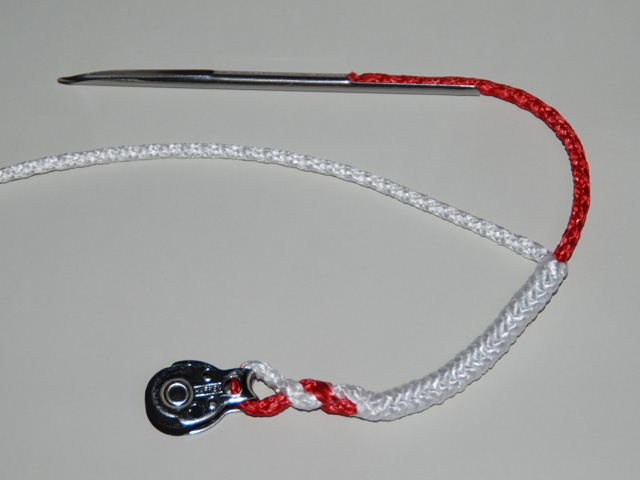 ロープの端にブロックなどを取り付けるとき、普通はもやい結びをしますが、私は、わりと好んでスプライスをします。